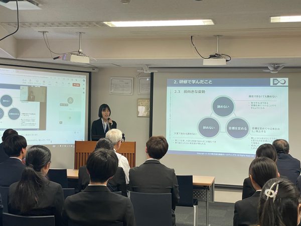 2024.04.11 新卒研修終了発表会が行われました 4/10(水)に新卒研修終了の発表会が行われました。 入社日から10日までに聴講した、社長講話やビジネスマナー、プレゼンテーションなどの研修について、 気づきや学んだことを一人ずつ発表しました。 4/15(月)からは、約2か月間技術研修が行われ、プログラミングやデータベースの基礎、システム開発について学びます。6/24(火)の終了時にはグループで成果を発表する予定です。
